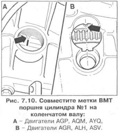 3. Совместите метки ВМТ поршня цилиндра №1 на коленчатом валу; А — Двигатели AGP, AQM, AYQ, В — Двигатели AGR, ALH, ASV (рис. 7.10).