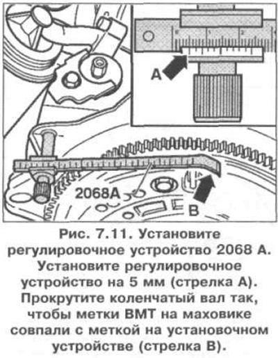 4. Установите регулировочное устройство 2068 А, как показано на рис. 7.11. Установите регулировочное устройство на 5 мм (стрелка А). Прокрутите коленчатый вал так, чтобы метки ВМТ на маховике совпали с меткой на установочном устройстве (стрелка В).