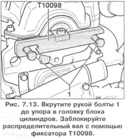 6. Вкрутите рукой болты 1 до упора в головку блока цилиндров (рис. 7.13). Заблокируйте распределительный вал с помощью фиксатора Т10098.