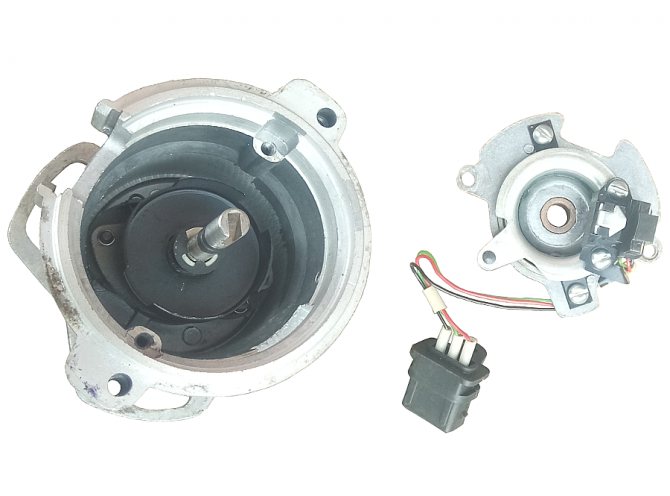 Датчик Холла находится внутри распределителя зажигания (распределителя). Магнитный элемент крепится к нижней пластине, под пыльником ползунка, двумя винтами. От него идут 3 провода: красный, зеленый и черный (плюс, импульс, минус) и подключаются к колодке, которая крепится к 1 винту на выходе из корпуса трамблера. Распиновка (распиновка) проводов именно в таком порядке.