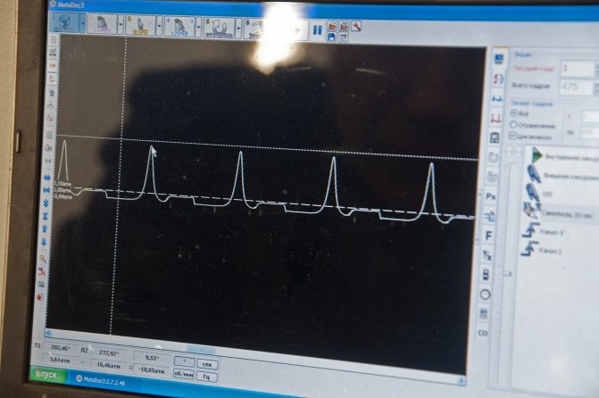 Для этого вместо свечи вкручиваем датчик давления, после чего запускаем двигатель. Главное не нажимать на педаль газа, датчик тестера двигателя этого не любит, и если есть проблемы с компрессией, то это будет видно на графике даже на холостых. Отдельно отметим, что мы измеряли не компрессию, а давление в цилиндре без зажигания: в этом есть разница.
