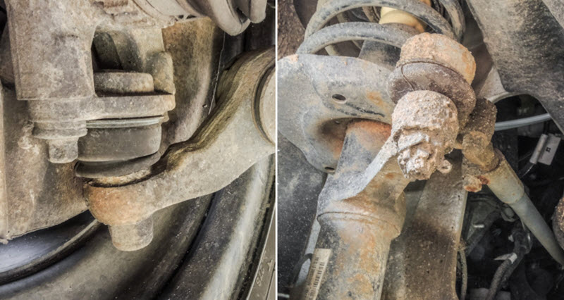 Если не осматривать узлы подвески снизу автомобиля, появляются проблемы двух типов — это рывки при проезде неровностей и скрипы при работе рычагов при малейших отклонениях, даже при ручном наклоне автомобиля.