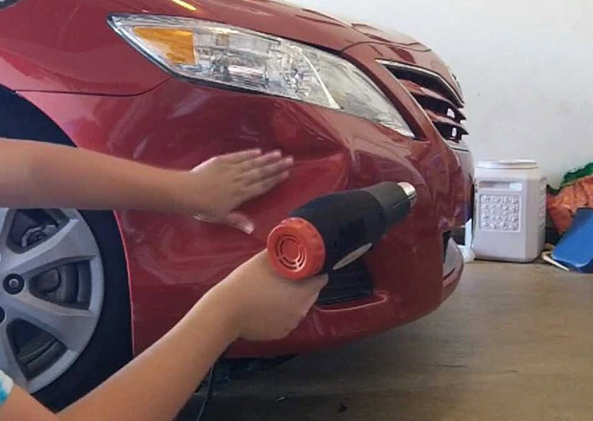 еще один способ устранить небольшие вмятины и царапины на пластиковом бампере автомобиля – выпрямить поврежденный участок с помощью термофена. Суть метода в том, что поврежденную поверхность равномерно прогревают строительным феном. Благодаря термической обработке повреждения выравниваются и расправляются.