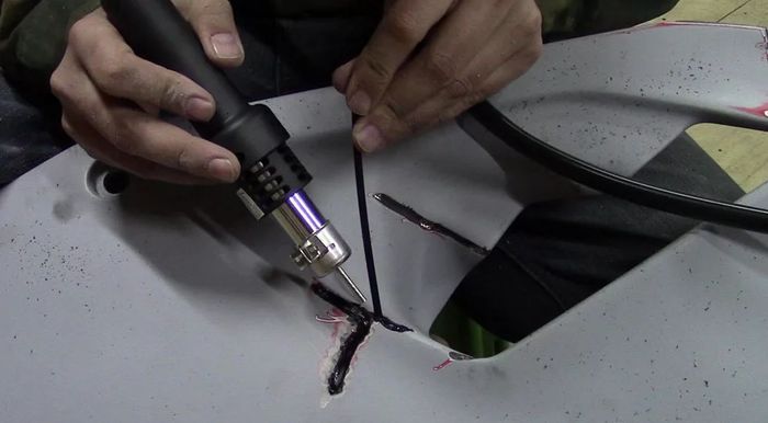 - Место ремонта зачищают и прогревают феном, заплатку также нагревают до жидкого состояния. Ремонтный полимер заливается в шов до заполнения трещины.