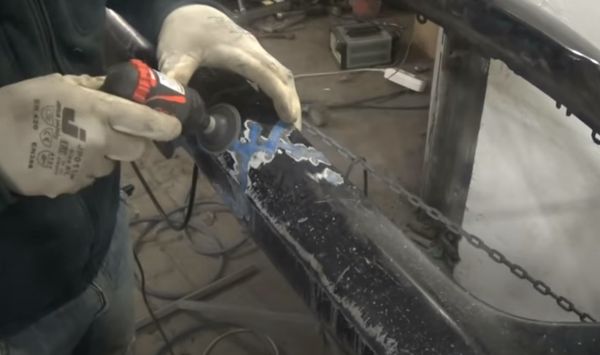 Сначала дремелем или мелкой болгаркой срезаем края трещины. Необходимо с обеих сторон сделать фаски, чтобы они выглядели как две оси, обращенные друг к другу. Образовавшиеся канавки будут заполнены нагретым пластиком с обеих сторон бампера.